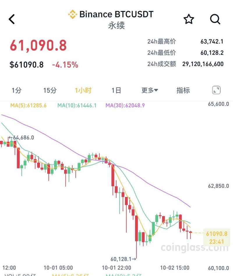 比特币自9月27日攀升至66500美元的2个月高点后,震荡走低。在近3个交易日内已累计下跌约7%。自10月1日晚间开始,比特币更是从63800美元急速下探至最低60128.1美元。截至发稿,跌幅有所收窄,最新交易价格为61090.8美元,日内跌幅超4%。