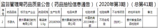 本次检查发现,贵州景峰注射剂有限公司生产的乐脉丸检验结果不符合规定,药品规格每袋装1.5g,生产批号20180906,检验依据中国药典2015年版一部,不合格项目为[性状]--,检验机构为贵州省食品药品检验所。