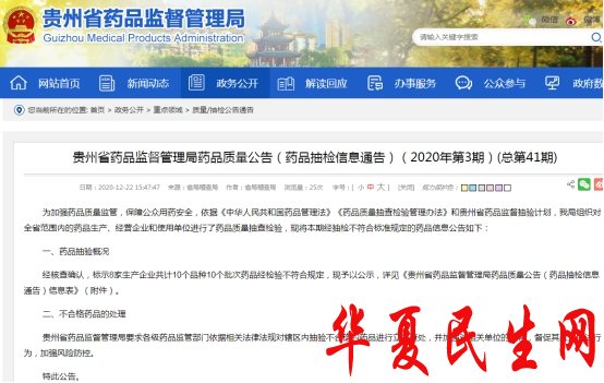 中国经济网北京12月24日讯(记者 马先震 孙辰炜) 贵州省药品监督管理局网站于昨日公示的《贵州省药品监督管理局药品质量公告(药品抽检信息通告)》((2020年第3期,总第41期)显示,经核查确认,本次发现标示8家生产企业共计10个品种10个批次药品经检验不符合规定,其中,上市企业湖南景峰医药股份有限公司(“景峰医药”,000908.SZ)以及吉林敖东药业集团股份有限公司(“吉林敖东”,000623.SZ)等名列其中。