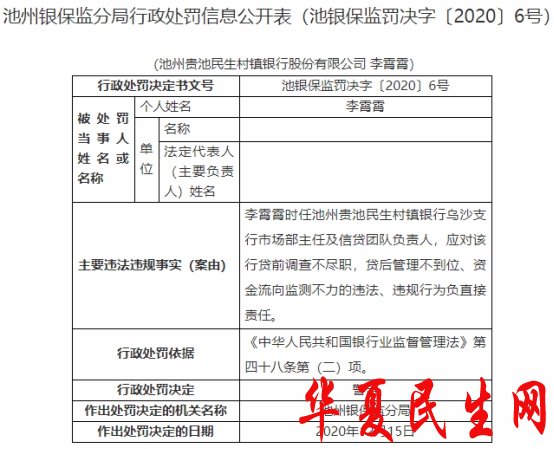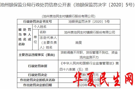 贵池民生村镇银行违法遭罚 贷前调查贷后管理均违规
