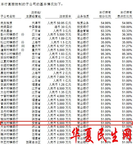 资料显示,池州贵池民生村镇银行股份有限公司为民生银行(600016.SH)子公司。民生银行2020年半年报显示,民生银行持有池州贵池民生村镇银行股份有限公司股份比例为51%。