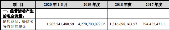 中伟股份销售商品、提供劳务收到的现金远远不及营业收入。2017年、2018年、2019年、2020年1-3月,中伟股份实现营业收入分别为18.62亿元、30.68亿元、53.11亿元以及15.69亿元;销售商品、提供劳务收到的现金分别为3.94亿元、13.17亿元、42.71亿元和12.06亿元。