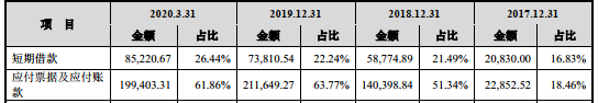 报告期各期末,公司应付票据及应付账款余额分别为2.29亿元、14.04亿元、21.16亿元、19.94亿元,占流动负债比例分别为18.46%、51.34%、63.77%、61.86%。