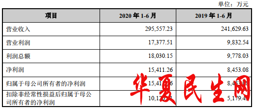 2020年1-6月,中伟股份实现营业收入为29.56亿元,同比增长22.32%;实现归属于母公司所有者的净利润为1.54亿元,同比增长82.32%;实现扣除非经常性损益后归属于母公司所有者的净利润分别为1.01亿元,同比增长95.40%;经营活动产生的现金流量净额为1582.93万元,去年同期为-2.50亿元。
