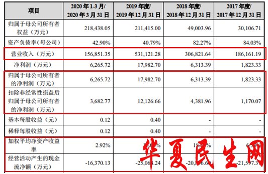 中伟股份经营活动产生的现金流净额连负3年。2017年、2018年、2019年、2020年1-3月,中伟股份实现归属于母公司所有者的净利润分别为1823.33万元、6313.39万元、1.80亿元、6265.72万元;扣除非经常性损益后归属于母公司股东的净利润分别为1170.07万元、4381.96万元、1.21亿元、3682.77万元;经营活动产生的现金流量净额分别为-2.16亿元、-2.08亿元、-2.51亿元、-1.64亿元。