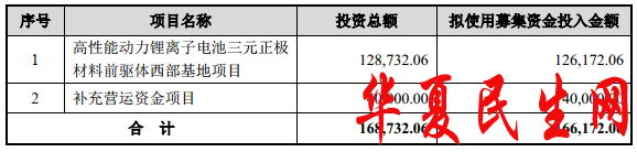 中伟股份最终募集资金比原计划少3.87亿元。中伟股份于12月17日披露的招股说明书显示,公司拟募集资金16.62亿元,其中12.62亿元用于高性能动力锂离子电池三元正极材料前驱体西部基地项目,4.00亿元用于补充营运资金项目。