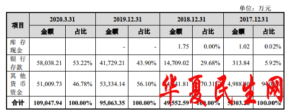 2017年末、2018年末、2019年末、2020年3月末,中伟股份货币资金分别为5303.26万元、4.96亿元、9.51亿元、10.90亿元。其中,银行存款为313.84万元、1.47亿元,4.17亿元、5.80亿元,占比分别为5.92%、29.68%、43.90%、53.22%。