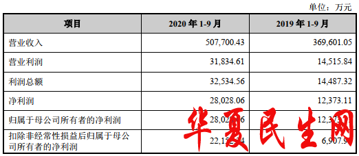 2020年1-9月,中伟股份实现营业收入为50.77亿元,同比增长37.36%;实现归属于母公司所有者的净利润为2.80亿元,同比增长126.52%;实现扣除非经常性损益后归属于母公司所有者的净利润为2.22亿元,同比增长220.68%;经营活动产生的现金流量净额为-1.24亿元,去年同期为-4.19亿元。