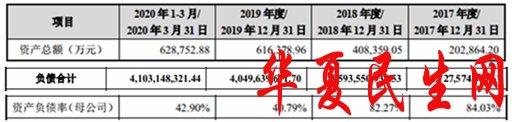 2017年末、2018年末、2019年末、2020年3月末,中伟股份资产总额分别为20.29亿元、40.84亿元、61.64亿元、62.88亿元;负债合计17.28亿元、35.94亿元、40.50亿元、41.03亿元。报告期内,公司资产负债率(母公司)分别为84.03%、82.27%、40.79%、42.90%。