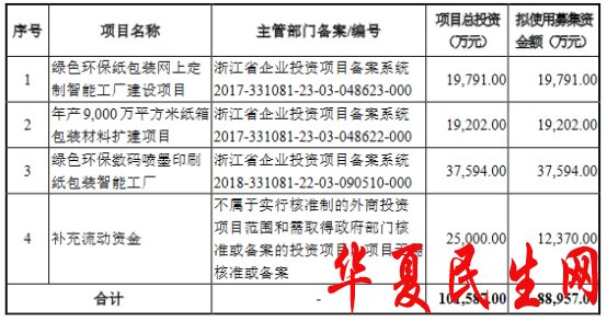 森林包装募集资金总额为9.49亿元,扣除发行费用后,募集资金净额为8.90亿元。其中,1.98亿元用于绿色环保纸包装网上定制智能工厂建设项目,1.92亿元用于年产9000万平方米纸箱包装材料扩建项目,3.76亿元用于绿色环保数码喷墨印刷纸包装智能工厂,1.24亿元用于补充流动资金。