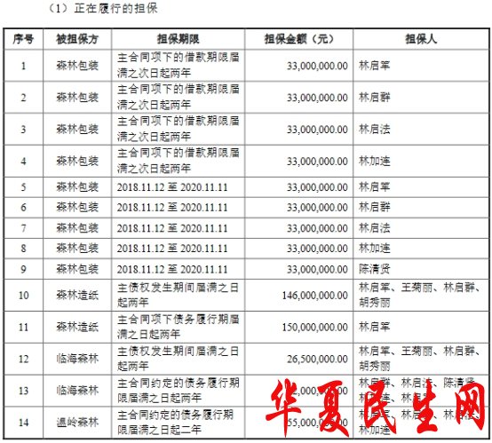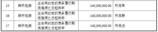 此外,报告期内,森林包装及全资子公司森林造纸、临海森林、温岭森林频繁接受关联方担保。其中,正在履行的关联担保共17项,已经履行完毕的关联担保共102项。