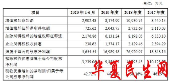 2017年至2020年1-6月,森林包装扣除税收优惠归属于母公司股东净利润分别为1.01亿元、1.66亿元、9484.07万元、3239.06万元,税收优惠增加的净利润占归母净利润比例分别为46.29%、38.36%、44.18%、42.72%。