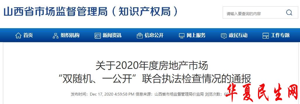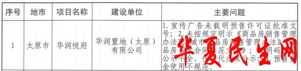 其中,位于太原市的华润悦府项目,建设单位为华润置地(太原)有限公司,主要问题是:1.宣传广告未载明预售许可证批准文号;2.未按规定明示《商品房销售管理办法》《城市商品房预售管理办法》《商品房买卖合同示范文本》;3.明码标价公示不全,代收代办未公示;4.预售资金使用不规范。
