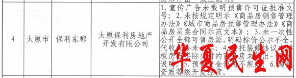 位于太原市的保利东郡项目,建设单位为太原保利房地产开发有限公司,主要问题是:1.宣传广告未載明预售许可证批准文号;2.未按规定明示《商品房销售管理办法》《城市商品房预售管理办法》《商品房买卖合同示范文本》;3.未一次性公开全部可售房源,明码标价公示不全,代收代办未公示;4.委托装修协议中样板房与实际交付的商品房未作出一致性说明;5.预售资金使用不规范;6.超越资质等级开发经营。