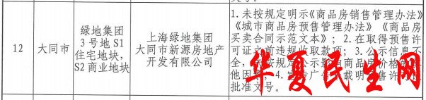 位于大同市的绿地集团3号地S1住宅地块、S2商业地块项目,建设单位为上海绿地集团大同市新源房地产开发有限公司,主要问题是:1.未按规定明示《商品房销售管理办法》《城市商品房预售管理办法》《商品房买卖合同示范文本》;2.在取得预售许可证之前违规收取款项;3.公示信息不全,未按规定公示影响商品房价格的其他因素;4.宣传广告未载明预售许可证批准文号。