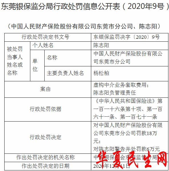 中国经济网北京12月22日讯 中国银保监会网站昨日公布的东莞银保监分局行政处罚信息公开表(2020年9号)显示,经查,中国人民财产保险股份有限公司东莞市分公司虚构中介业务套取费用;当事人陈志阳负管理责任。