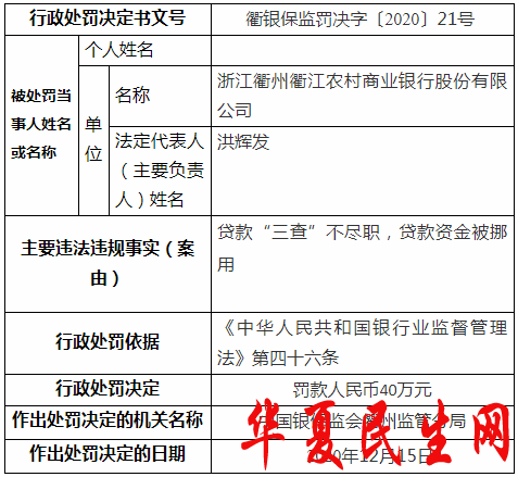2020年12月15日,中国银保监会衢州监管分局依据《中华人民共和国银行业监督管理法》第四十六条,对浙江衢州衢江农商行罚款人民币40万元。