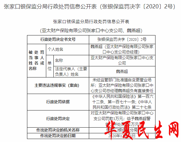 亚太财险张家口中支违法遭罚 未经批准变更营业场所