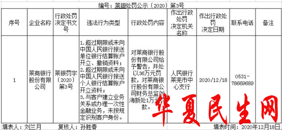 人民银行莱芜市中心支行对莱商银行股份有限公司给予警告,并处以36万元罚款,对莱商银行股份有限公司财务总监刘海新处1万元罚款。