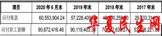 公司2017年末至2020年6月末应付账款分别为2953.33万元、4649.03万元、5722.84万元、6055.39万元;应付职工薪酬分别为5330.82万元、7036.76万元、9011.94万元、9067.24万元。