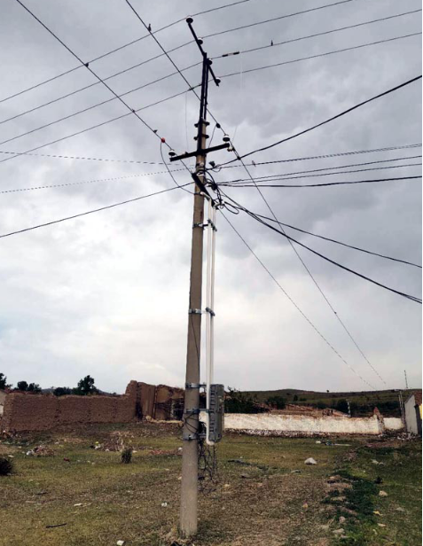 小庄科村一处高压线的电线杆,由于高度不够,以前直接在杆体上方接上两块角铁,然后再在上面架线,但农网改造时依然没有更换新的线杆。而在我们调查过程中,这种在旧的电线杆上加角铁的情况还不在少数。