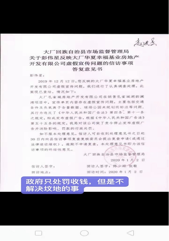 1.直至2019年收房之时业主开启了艰难的维权之路,从大厂县,到廊坊市,到北京市一路上访维权下来,大厂政府仅仅对该企业以虚假销售为由处罚了十万余元,后撇清关系公告了事。并未对坟地之事做任何处理协调。处罚公示如下图所示: