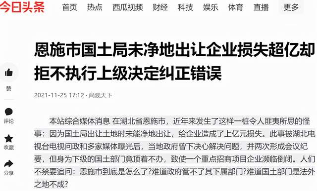 本站综合媒体消息 在湖北省恩施市,近年来发生了这样一桩令人匪夷所思的怪事:因为国土局出让土地时未能净地出让,给企业造成了上亿元损失。此事被湖北电视台电视问政和多家媒...