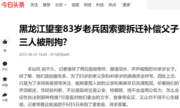 相关新闻:黑龙江望奎:83岁老兵与子女因讨要拆迁款被刑拘释放时不给手续?