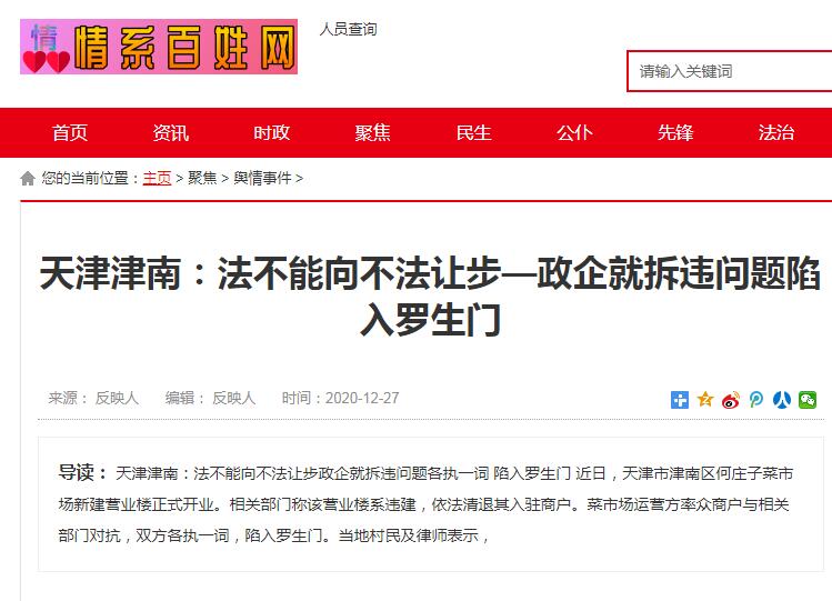 津南区有关部门的公开回复证实了该村民的说法:津南区称已多次告知菜市场运营方,其新建的营业楼手续不全,需办理相关手续后才能建设。2020年9月,津南区有关部门下达处罚决定书,要求菜市场运营方拆除违法建筑,退还土地。