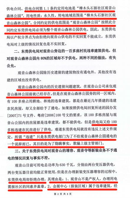 2022年2月,东莞市供电局书面回复观音山公司称,目前已供电至观音山公司红线,红线范围内用户用电设施应自行建设维护;观音山公司2003年报装用电,至今一直正常用电。