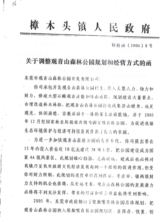 2006年10月10日,樟木头镇政府向东莞市政府上报文件《关于将观音山森林公园纳入全市森林公园建设规划的请示》,请求由市政府投入主要资金进行基础及配套设施建设。同年11月11日,东莞市政府作出《关于将观音山森林公园纳入全市森林公园建设规划问题的复函》,批准“将观音山森林公园纳入银瓶嘴森林公园总体建设规划中”、“项目设计的收回经营权及征地补偿费用由你镇政府负责解决”、“工程建设资金有市镇两级按比例分担”。