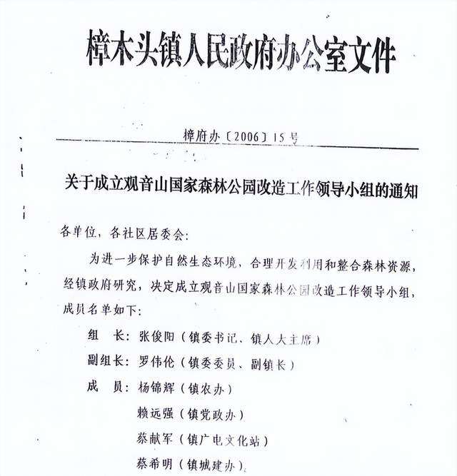 2006年初,以为了“把观音山森林公园做强做大”为由,樟木头镇、政府决定收回观音山森林公园的经营权,由镇政府担任投资主体和经营主体。为此,专门成立了观音山国家森林公园改造工作领导小组。
