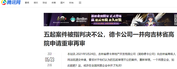 2021年5月24日,吉林省德卡房地产开发有限公司(简称德卡公司)向吉林省高级人民法院递交申请,要求对于他们认为的五起审理不公的案件,重新审理。一个民营企业,如此胆肥?这,或许在全国民营企业中开了先河!