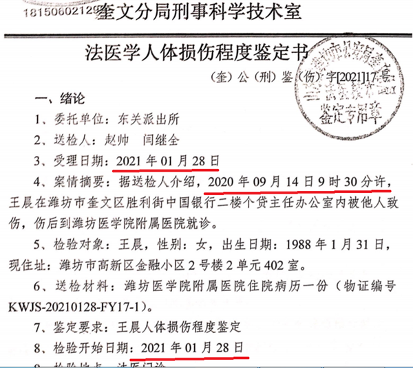 本案的案发时间是2020年9月14日上午10时左右,该日下午16时11分,王晨报警。2020年9月21日,王晨在接受询问时提出申请人体损伤程度鉴定,然而到2021年1月28日,东关派出所才委托奎文分局刑事科学技术室对王晨进行人体损伤程度鉴定。2021年3月25日作出处罚决定,时间为192天,扣除鉴定期间7天,办案天数是185天!
