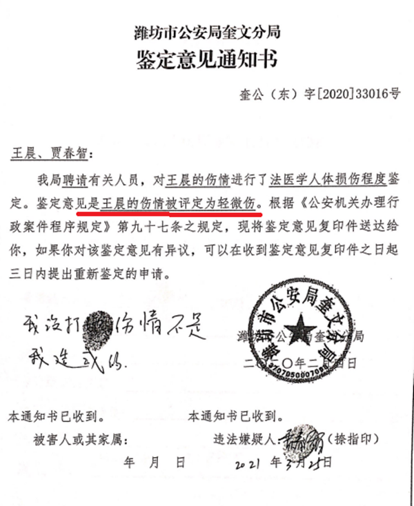 2021年2月8日,奎文分局向我邮寄了王晨的伤情鉴定结论,其中并没有附《鉴定意见通知书》,而是在作出处罚决定的当日,即3月25日,办案机关才告知我有申请重新鉴定的权利,同时要求我在《行政处罚决定书》上签名(签名时间为2021年3月25日)。奎文分局在我没有明确表示放弃申请重新鉴定的情况下,在告知该权利当日就作出处罚决定,是变相限制我的救济权利行为,更没有就有关情况进行复核,侵犯了我就案件关键事实进行申辩的权利,属于重大的明显的剥夺我的实体权利的严重违法行为。