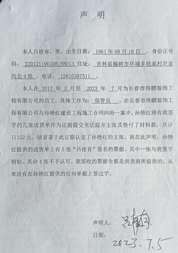 更令企业难以接受的是垫付材料款的认定。判决支持孙艳红垫付材料款1.1万余元,但公司称合同明确约定包清工、材料由公司提供,从未委托孙艳红代购材料。关键证据中出现的“吕桂有签收材料单”,经该员工本人声明系伪造。公司质疑,法院未进行笔迹鉴定或深入核查,仅以“不排除代买可能性”为由支持该诉求,缺乏证据支持。