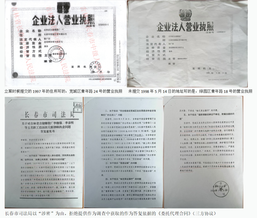 2019年6月,田大原以其担任主任的吉林衡丰律师事务所名义,与长春市宽城区发改局局长郭中凡、副局长纪勇签订了《委托代理协议》(一份三方协议),公然帮助宽城区的发改局制造虚假诉讼主体,拿着作废的营业执照以及伪造的企业公章,以橡胶厂的名义对本厂职工提起了诉讼。在长春市中级法院审理的(2019)吉01民初913号案件中,承办法官郭宇采信了田大原一方提交的所谓“职工代表大会决议”复印件作为关键证据,并据此认定职工“无权占有”企业资产。然而,该决议既无原件可供核对,其上职工签名的真实性也存有重大疑问,其证据资格和证明力均严重不足。法院以“职工无社保记录”为由否认其职工身份,将其认定为“来路不明人员”,却刻意回避了企业早已被吊销营业执照、职工客观上无法继续缴纳社保这一关键事实,使用已作废的营业执照和伪造的公章能够成功立案并推进诉讼,本身就已涉嫌违反《中华人民共和国刑法》第三百零七条之一的规定,构成了虚假诉讼罪。这不仅严重损害了涉案职工的合法权益,更是对司法公正和诉讼秩序的公然挑战。