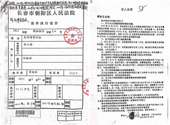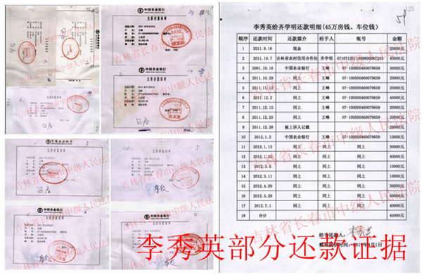 见到记者时,李秀英气愤的说:自己和齐小明总共从齐学明处借款92万元,还款总额为100万元(因为没有对账),从2010年4月3日至2012年7月1日已经还清了全部借款。但是齐小明、齐学明哥俩却主观恶意串通,隐瞒全部还款事实,捏造夫妻债务,企图抢夺我的财产,而本案法官竟然不管青红皂白,也不管他们的证言有多么矛盾、虚假,竟然连他们自相矛盾的说法连论述都没有论述,就直接采信了自相矛盾的证据,明显的是在枉法裁判。有录音证据证明,为了打赢这场官司,他们动用了朋友关系,找了法院的人、公检法的人,还动用了黑社会,果不其然陌生人多次敲门。铁的证据证明,这是一起典型的既遂虚假诉讼案,可是朝阳区法院和长春市中级法院却支持他们的虚假证据。请问,是可忍,孰不可忍?我一定要继续向上反映问题,直到正义得到伸张,虚假诉讼的犯罪分子和他们的保护伞被绳之以法。
