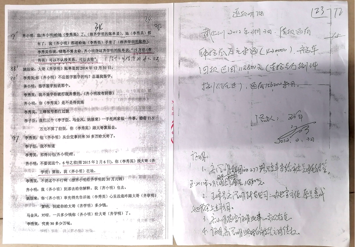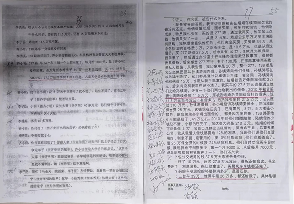 李秀英向记者介绍:李秀英与齐小明、齐学明的债务纠纷源自四笔借款:婚前2009年11月15日,向齐学明借款20万元;婚后2010年8月17日借款27.5万元;2011年1月10日借款34万元;2011年12月13日借款10.5万元。四笔借款共计92万元,实际还款100万元(因为没有对账)。此外,2011年9月14日齐小明向齐学明借款15万元(借给朋友孙振涛,此款已还款完毕)。正是由于上述款项,才引来齐学明的起诉。