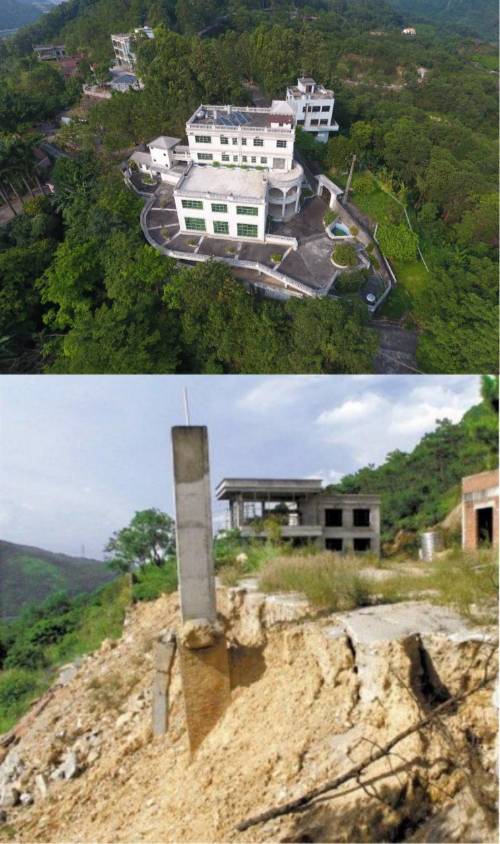 公园工作人员说,这两栋别墅建于2009年前后,建造时,周围的树木被伐,其中一栋的正下方曾发生滑坡,在2019年被拆除。记者在现场看到,这两处建筑附近草木稀疏,除杂草外,仅有一小片补种的树苗,与周边山坡上成林的树木对比鲜明。从山下往上看,这两处建筑下方不远处部分黄土裸露。