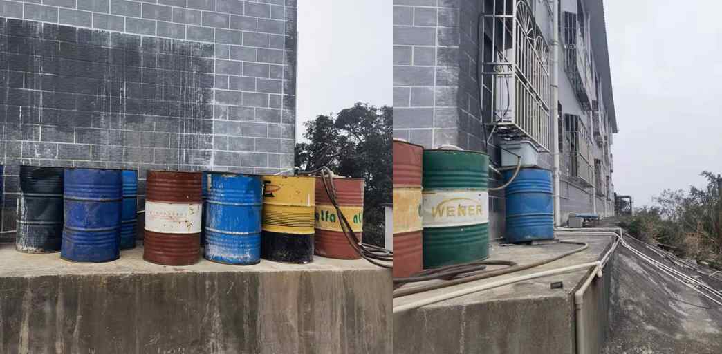 寺庙宿舍楼屋檐下的柴油桶