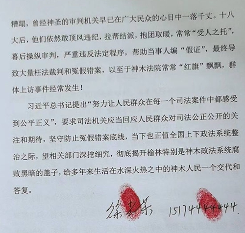 习近平总书记提出“努力让人民群众在每一个司法案件中都感受到公平正义”,要求司法机关应当回应人民群众对司法公正公开的关注和期待,坚守防止冤假错案底线,当下也正值全国上下政法系统整治之际,望相关部门深挖细究,彻底揭开榆林特别是神木政法系统腐败黑暗的盖子,给多年来生活在水深火热之中的神木人民一个交代和答复。