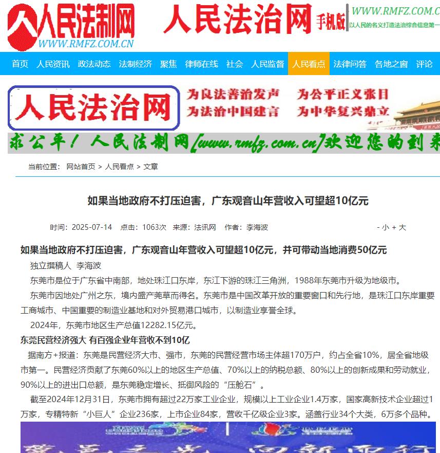 吕市长你们要坚持增资扩产和招商引资两手抓、协同推进,在撰稿人写的《只要政府不打压,广东观音山年营收入可超10亿元,带动当地消费50亿元》可以看到观音山公园有多大的潜力吧?!观音山这个举世闻名的文旅企业的项目效益大家都看得见、摸得着,遭遇由东莞市委原书记刘志庚、原市长李毓全、原纪委书记甄瑞潮、原政法委书记张某雄等人率东莞市相关部门二十多年那么多的迫害为何为何视而不见呢?难道,你们还在为这块“唐僧肉”而动心吗?可是东莞市已有不少领导干部因受贿等罪名被查出啊?难道没人害怕吗?须知只要你为人民真心实意的办事,人们会看在心里而会真诚的表达自己谢意的!人民的谢意比真金白银要可靠得多!谢意是无尚荣耀,而真金白银是要毁灭!