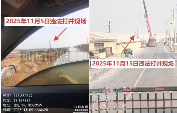 2021年5月,因曹妃甸区农业农村局、自规局等部门的“双标执法”行为,导致张贺龙承包厂区内的生产用水井被查封,5年来张贺龙多次到相关部门反映问题,始终未得到解决。而在这5年间违法打井行为一直存在。该事件被媒体曝光后不仅未得到遏制,反而呈现“愈演愈烈”之势。11月5日,即事件曝光后的关键整改期,违法打井设备仍在现场作业;时隔10天,11月15日,另一地点的非法钻井行为也在上演。