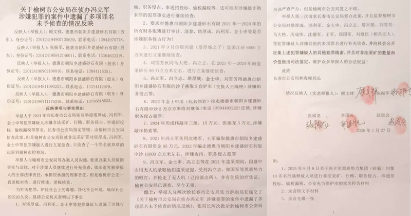 2026年初,26名股东第三次向长春市公安局请求督办,要求榆树市公安局对冯立志、塔兴银、刘雪芳等多名遗漏的犯罪嫌疑人补充侦查,对非法采矿的数量和价值做司法鉴定,并向社会公开征集犯罪线索。“冯立军团伙在当地经营多年,人脉复杂,我们担心有人从中干预,让重罪轻判、漏罪不究。”股东们的担忧并非空穴来风,当地多名公职人员涉嫌利益勾结的背景,让案件的公正办理充满变数。