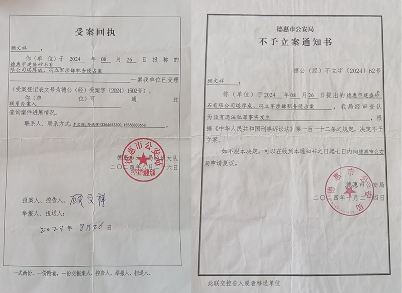 这些涉嫌充当“保护伞”的公职人员,让股东们的本地举报之路举步维艰。2024年8月,股东顾文祥以冯立军、塔厚成涉嫌职务侵占罪向德惠市公安局报案,该局出具《受案回执》后,同年10月却以“没有犯罪事实发生”为由出具《不予立案通知书》,明显的侵占事实被轻易否定。