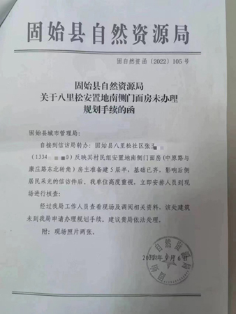 在这期间,我们找县土地局和南湖办事处长达几个月,无结果都互相推。也多次打过12345和12319热线电话,问题也没解决。无奈之下,我们于8月19日县领导杨某某接访,因他有事未见本人,我们的信访件于8月23日县领导赵某某给了回复:按规划建设。最后,我们又找到县自然资源局刘局长和汪副局长。9月6日县自然资源局下发了关于八里松村安置地南侧门面房未办理规划手续的函。