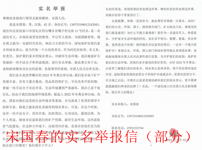 宋国春在举报信中说:我宋国春,是一名退伍军人,在部队深受党的教育,牢记军人使命,为祖国献青春。现在,我又作为一名新时代农民,响应习主席的号召,深知保护好我们家乡的绿水青山,是当代每一个公民的责任,作为村民有权利、有义务、有责任、保护我们家乡的绿水青山,对破坏生态环境,违法偷盗矿石资源的一些不法分子和利益集团,进行实名举报,就此事公布于众。我同时求助新闻媒体及社会的监督,希望引起各级领导的重视、全国人民关注和支持。