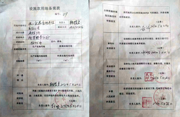 梁山金泰畜牧养殖有限公司(王志民)所办理的设施农用地备案表显示签批时间为2021年5月26日,养殖场拟建地点是杨营镇李庄村,申请面积为8.6415亩,自然资源和规划局杨营所只有负责人签字,没有加盖公章。