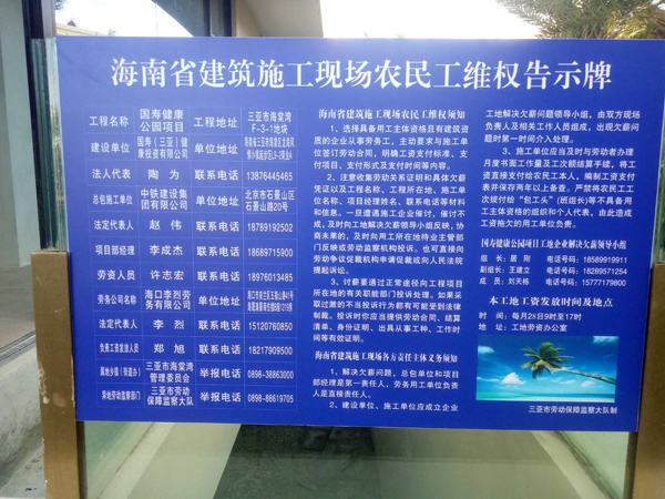 在施工现场展示的一块《海南省建筑施工现场农民工维权告示牌》显示:该工程名称为国寿健康公园项目;工程地址为三亚市海棠湾F-3-1地块;建设单位为国寿(三亚)健康投资有限公司;总包施工单位为中铁建设集团有限公司,项目部经理李某杰;劳务公司名称为海口李烈劳务有限公司。据了解,工头两口子是河南的。